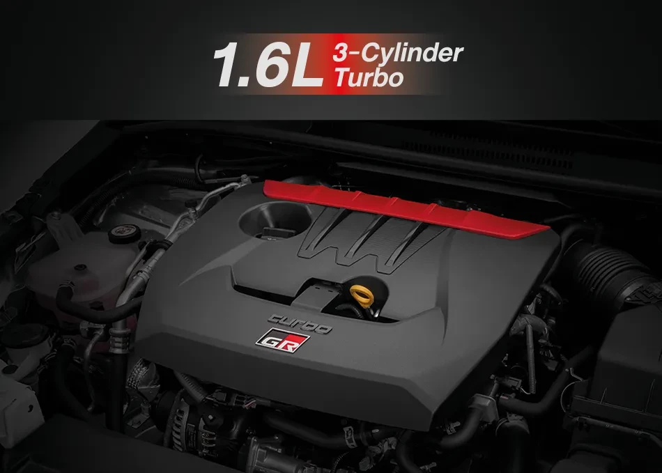 Limitless Untamed Energy | เครื่องยนต์ G16E-GTS 3 สูบ DOHC 12 วาล์ว กำลังสูงสุด 300 แรงม้า (PS) แรงบิดสูงสุด 400 นิวตัน-เมตร GR-Four ระบบขับเคลื่อน 4 ล้อ | ช่วยให้ควบคุมรถได้ง่ายทุกสภาพถนน โดยเฉพาะเมื่อใช้ความเร็วสูงหรือขณะเข้าโค้ง ด้วยการกระจาย กำลังขับเคลื่อนสู่ล้อหน้า:หลัง ด้วยโหมดการขับขี่ 3 รูปแบบ ได้แก่ Normal Mode 60:40 / Gravel Mode 50:50 / Track Mode 60:40-30:70