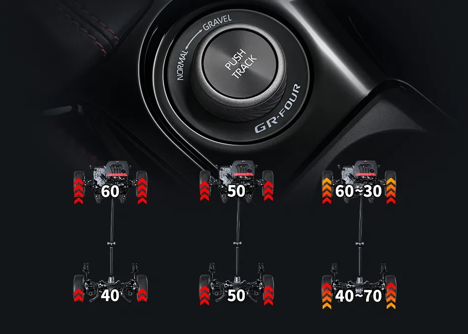 GR-Four ระบบขับเคลื่อน 4 ล้อ | ช่วยให้ควบคุมรถได้ง่ายทุกสภาพถนน โดยเฉพาะเมื่อใช้ความเร็วสูงหรือขณะเข้าโค้ง ด้วยการกระจาย กำลังขับเคลื่อนสู่ล้อหน้า:หลัง ด้วยโหมดการขับขี่ 3 รูปแบบ ได้แก่ Normal Mode 60:40 / Gravel Mode 50:50 / Track Mode 60:40-30:70